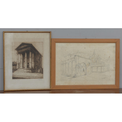 Lotto composto da un acquerello raffigurante il Tempio d'Augusto a Pola e un disegno raffigurante le colonne di San Lorenzo a Milano, di autori e misure differenti, in cornici (difetti)