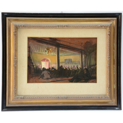 "Lo spettacolo" olio su tavola (cm 32x48 circa) siglato e datato 1956 in basso a destra, in cornice (lievi difetti)