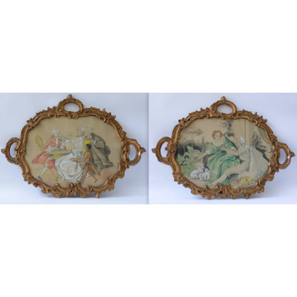 Ignoto "Scene galanti" coppie di tecniche miste su cartoncino di forma sagomata (cm 45x62) in cornici in legno dorato ed intagliato a motivi vegetali (difetti)