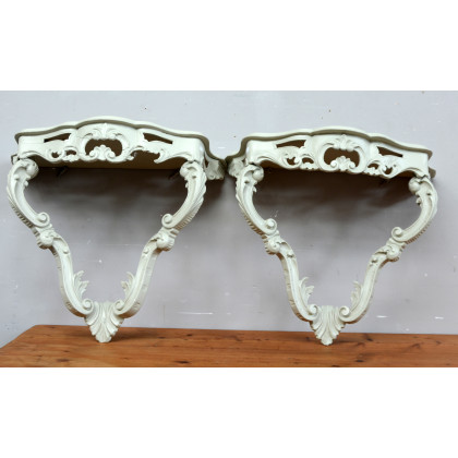 Coppia di mensoline in legno intagliato a decoro rocaille e laccato color grigio (cm 55x46x26) (difetti)