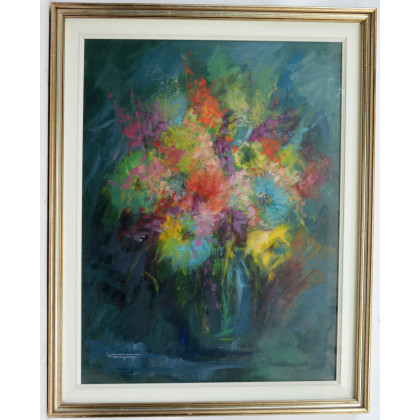 "Ricordo di una estate" olio su tela (cm 60x80) firmato in basso a sinistra, titolato, firmato, datato e dedicato al verso, in cornice