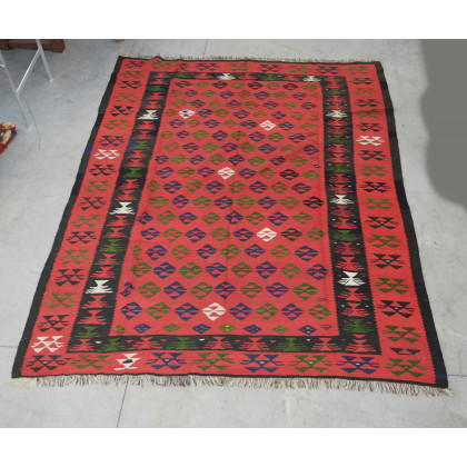 [Tappeti] Tappeto Kilim Sharkoy, Asia Minore. Disegno geometrico nei toni del blu, verde e bianco su fondo rosso (cm 282x214) (lievi difetti e restauri) Provenienza: Collezione privata lombarda