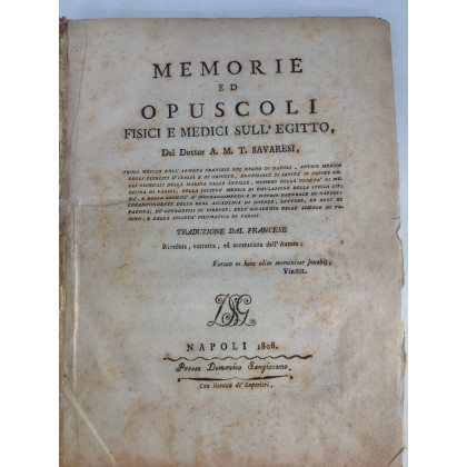 SAVARESI, Antonio Mario Timole. Memorie ed opuscoli fisici e medici sull'Egitto. Napoli: Domenico Sangiacomo, 1808. Volume in 4to con marchio tipografico dell'editore al frontespizio e incisioni all'interno del testo (fioriture). Legatura in cartone (entrambi i piatti sono staccati dal libro).