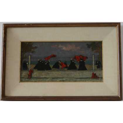 "Spiaggia privata"1968 olio su tavoletta (cm 19,5x39) Firmato in basso al centro. Iscritto e titolato al retro, in cornice. Opera accompagnata da certificato di autenticità rilasciato dal Dott. Giorgio Borghi (n. di archivio H/2013HB).
