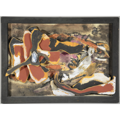 "Senza titolo" 1990, assemblage di legni e sassi dipinti (cm 49x67)firmato e datato in basso a sinistra. Firmato e datato al retro. In cornice (lievi difetti)