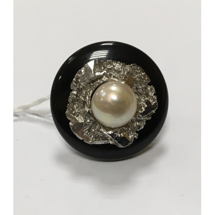 PAOLO BELLINI Anello di forma circolare in galalite e metallo color argento centrato da perla fancy