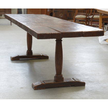 Tavolo con gambe tornite poggianti su piede a ciabatta costruito con elementi antichi (cm 279x80x78)(difetti). Evento ETRO "Dandy Detour".