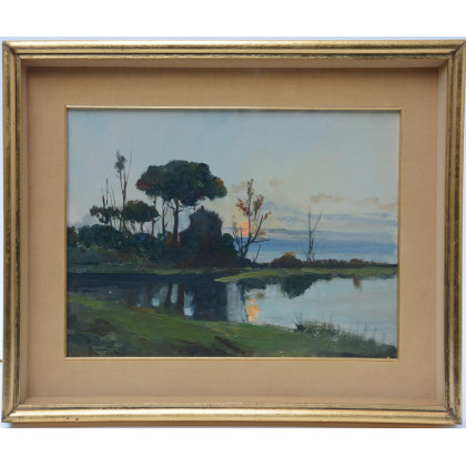 "Paesaggio al tramonto" olio su cartone telato (cm 30x40) Firmato in basso a sinistra. In cornice