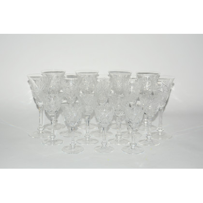 Servizio di bicchierini in cristallo composto da nove calici per acqua, tredici per vino rosso e sette per bianco, e dodici flûte (lievi difetti)