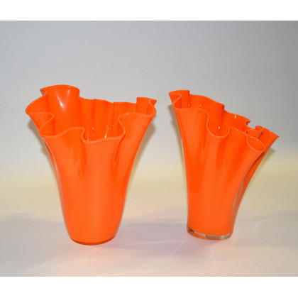 Lotto composto da due vasi a fazzoletto in vetro opacizzato arancio (h max cm 31,5)