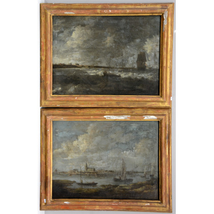 Coppia di antichi dipinti ad olio su tela raffiguranti paesaggi marini con imbarcazioni (cm 38x51) in cornici (difetti)