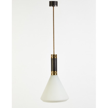 Lampada a sospensione in metallo verniciato nero e ottone, diffusore in vetro incamiciato lattimo. Italia, anni 60 (h cm 90) (lievi difetti)