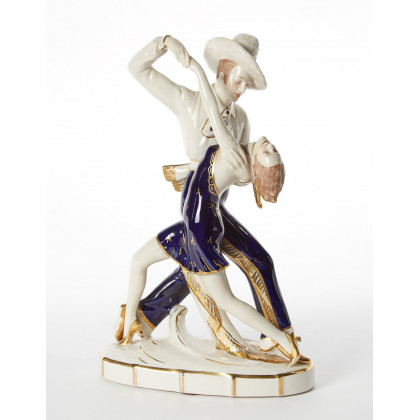 Manifattura Royal Dux. Scultura in porcellana policroma sottovetrina profilata in oro, raffigurante una coppia di danzatori di tango. Boemia, anni 30 (j cm 24, h cm 37) (lievi difetti)