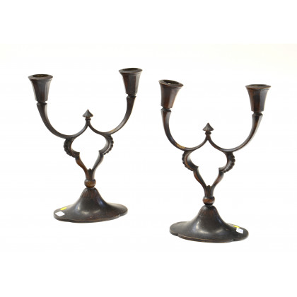 Coppia di candelabri in bronzo di gusto barocchetto. Esecuzione danese, anni 20. Monogramma della manifattura e numerale incussi sotto la base (h cm 23) (lievi difetti)