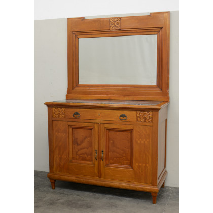 Comò con specchiera "Liberty" ad un cassetto e due sportelli in legno intagliato a fiori e foglie e filettato a motivi geometrici, piano in marmo. 1910 ca. (Cm 130x203x59)(difetti)