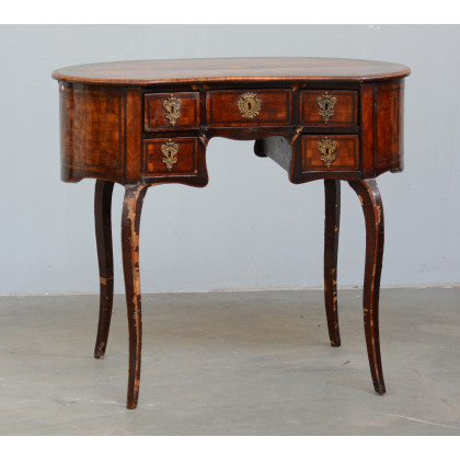 Scrittoio da centro in stile Luigi XV con piano a fagiolo, decoro a marqueterie con fronte a cinque cassetti (cm 94x82x60) (difetti e mancanze)