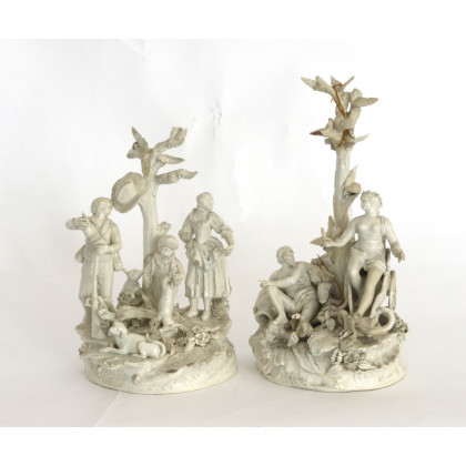 Lotto di due gruppi plastici in ceramica bianca raffiguranti una scena mitologia e di caccia (h max cm 29) (difetti, restauri e mancanze)