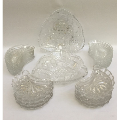 Lotto composto da una coppia de centrotavola a forma di foglia, un gruppo di 14 ed un gruppo di 10 antipastiere a mezzaluna, in cristallo molato (difetti)