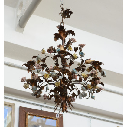 Lampadario a sei luci a forma di cespo di fiori in metallo e ceramica (difetti)