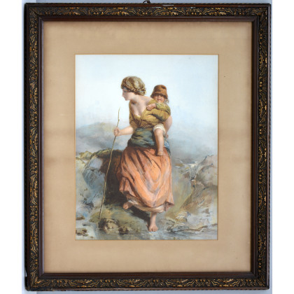 Riproduzione raffigurante una "Contadina con bambino" (cm 44x34) in cornice (lievi difetti)