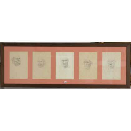 Gruppo di cinque disegni a matita raffiguranti marinai. Firmati Roelli ‘60. In unica cornice (misure cornice cm 48x139) (cm ogni foglio cm 29x19) (difetti)