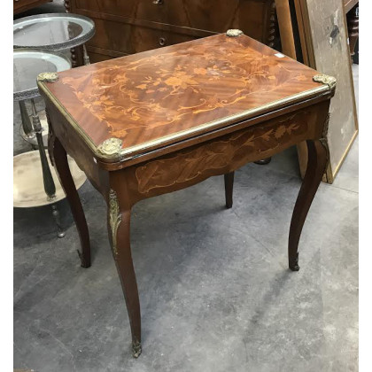 Tavolo da gioco decorato a riccioli e motivi floreali, piano apribile e fasce sagomate. Gambe mosse, applicazioni in metallo dorato (aperto cm 100x72x70) (difetti)