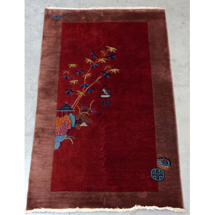 Tappeto Decò, Cina, inizio secolo XX . Decoro con rami fioriti asimmetrici su campo color granata(cm 200x120) (difetti)