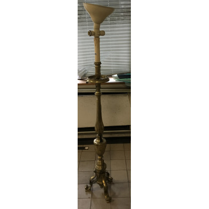 Torciera in ottone con fusto tornito su base tripode, montata a luce elettrica (h. cm 136)