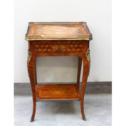 Tavolino da centro ad un cassetto lastronato e intarsiato a motivi geometrici e floreali. Piano e montanti decorati in rilievo (cm 46x68x35) (difetti e mancanze)