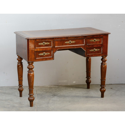 Piccolo scrittoio da centro a cinque cassettini riquadrati, gambe tornite, piano in marocchino impresso in oro, secolo XIX (cm 89x77x53)(difetti)