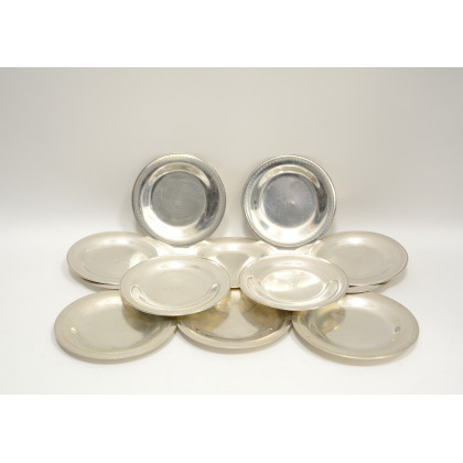 Gruppo di dodici piattini in argento con bordo cesellato a palmette (gr 1950 ca)
