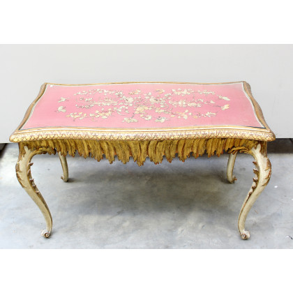 Tavolino in legno laccato e dorato intagliato nelle fasce a motivi concatenati (cm 94x57x50) (difetti)
