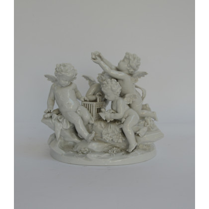 Manifattura napoletana, gruppo in porcellana raffigurante amorini che giocano con gli uccelli (lievi difetti) (h cm 19)