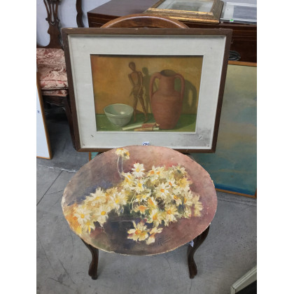 Lotto composto da un dipinto ad olio raffigurante natura morta in cornice e un'acquarello raffigurante fiori, autori e misure diverse (difetti)