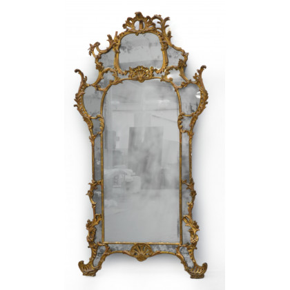 Grande specchiera di forma sagomata in legno intagliato e traforato, decorato a fiori, volute e conchiglia stilizzata. Secolo XIX (cm 240x130) (difetti)