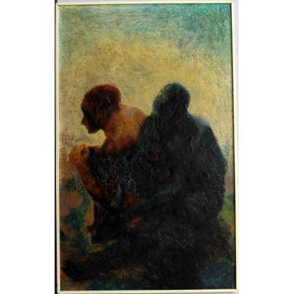 "I mendicanti" 1970 tecnica mista su tavola cm 115x70 firmato e datato in basso a destra. In cornice Esposizioni "Trento Arte Oggi 1971" Mostra d'Arte Contemporanea, Roma (etichetta al retro)
