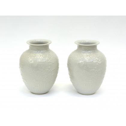 Coppia di vasi monocromi bianchi in porcellana a pasta tenera con decoro in rilievo (h. cm 25) Cina, sec. XIX (lievi difetti)