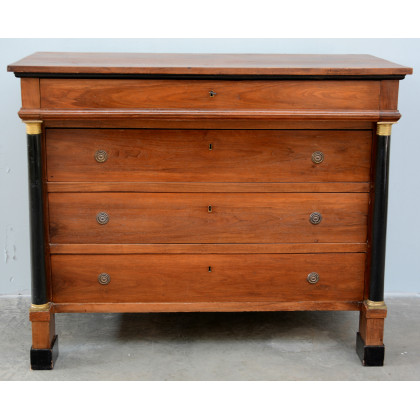 Cassettone impero in mogano a tre cassetti più uno sottopiano aggettante. Colonne laterali intere ebanizzate con capitelli in metallo dorato. Piedi a plinto (cm 142x116x69)(difetti)