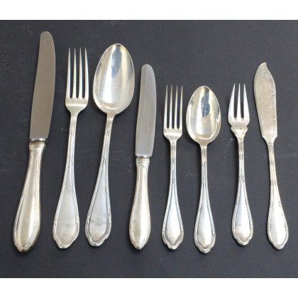 Parte di servizio di posate in argento composto da : ventitre coltelli, ventiquattro forchette e dodici cucchiai grandi, undici coltelli, dodici forchette e undici cucchiai, dodici coltelli e dodici forchette da dolce (gr 4500 senza coltelli) (difetti)