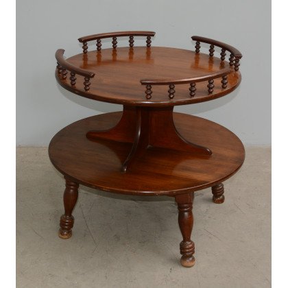 Tavolino tondo in legno a due ripiani con ringhiera e piedi torniti ( cm 74x72x74) (difetti)