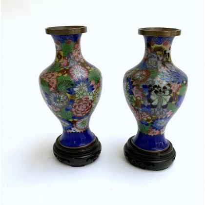 Coppia di vasi a smalto cloisonné, basi in legno Cina, sec. XX (h. cm 17) (difetti)