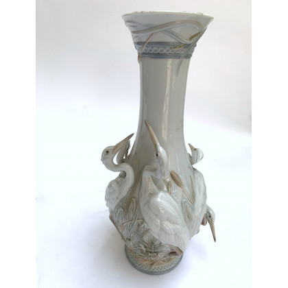Manifattura di Lladrò. Vaso a bottiglia in porcellana decorata in rilievo a aironi (h. cm 34) (difetti)