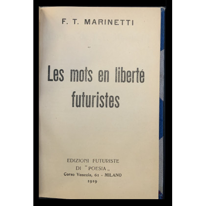 MARINETTI, Filippo Tommaso. Les Mots en Libertè Futuristes. Milano: Edizioni Futuriste di "Poesia", 1919. 8vo, legatura posteriore in seta policroma. Non collazionato e difetti da esaminare.