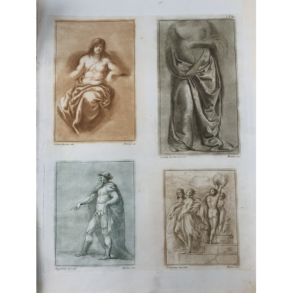 MULINARI, Stefano. Disegni originali d'eccellenti pittori esistenti nella Real Galleria di Firenze incisi ed imitate nella loro grandessa e colori. [Firenze: c.1774]. 39 (di 50 tavole numerate) con le seguenti tavole XI-XXII, XXIV-L. Folio elefante, frontespizio e tavole stampate in seppia con molteplici illustrazioni a cura di Molinari da vari artisti (alcuni difetti). Mezza pelle coeva (gravi difetti, manca il dorso)