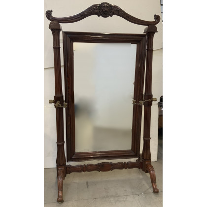 Psiche da terra lastronata con specchio basculante, montanti a colonne scanalate sormontate da cimasa intagliata a volute centrate da testa leonina. Secolo XIX (cm 230x145x67 circa)