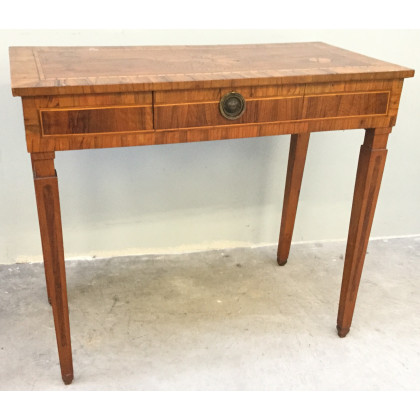 Tavolo scrittoio ad un cassetto nella fascia in legno lastronato e intarsiato in legni vari, piano centrato da rosone entro cornice, gambe rastremate. Marchio a fuoco al retro. Secolo XVIII (cm 90x77,5x45) (difetti e restauri)