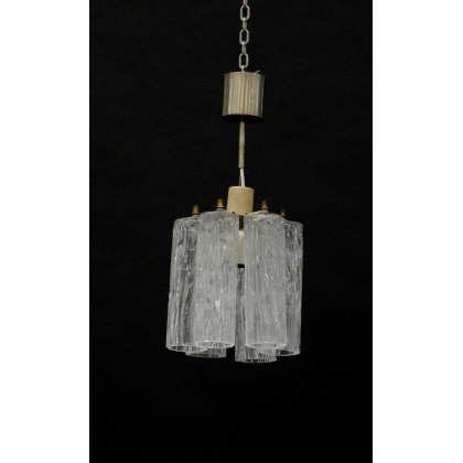 Lampada a sospensione con struttura in metallo verniciato bianco, pendenti cilindrici in vetro cristallo corrugato soffiato in stampo. Murano, anni '70. (h cm 47,5; d cm 22)