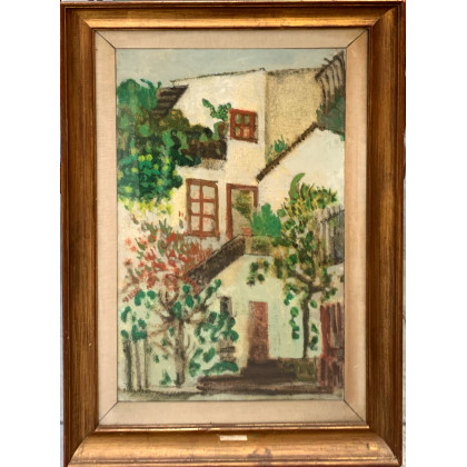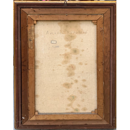 Amedeo Ruggiero "Scorcio con case, terrazzi e piante" olio su tela (cm 80x50) firmato in basso a sinistra, in cornice (lievi difetti)