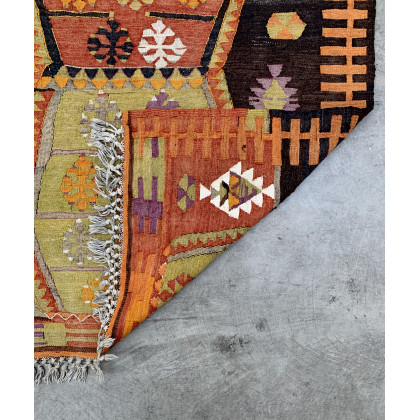 Tappeto passatoia Kilim, Anatolia, secolo XX. Decoro con sette esagoni di differenti colori su fondo marrone (cm 353x92) (difetti)