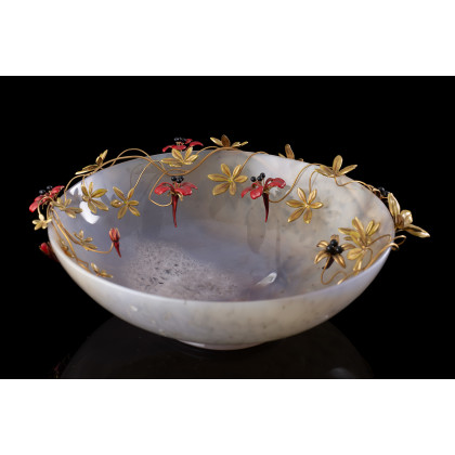 ROMOLO GRASSI Agate table floral ornament as a cup with yellow gold and enamel flowers and leaves on the rim, gross g 466.32 circa, diam. cm 17 circa. Marked 662 MI. With case. For comparison see: Romolo Grassi "GOLDSMITH'S WARES FROM A LOMBARD WORKSHOP. PREFAZ. DI G. GREGORIETTI, INTRODUZ. DI M. VALSECCHI." Edition Cappellini Stampatore, ill. 75